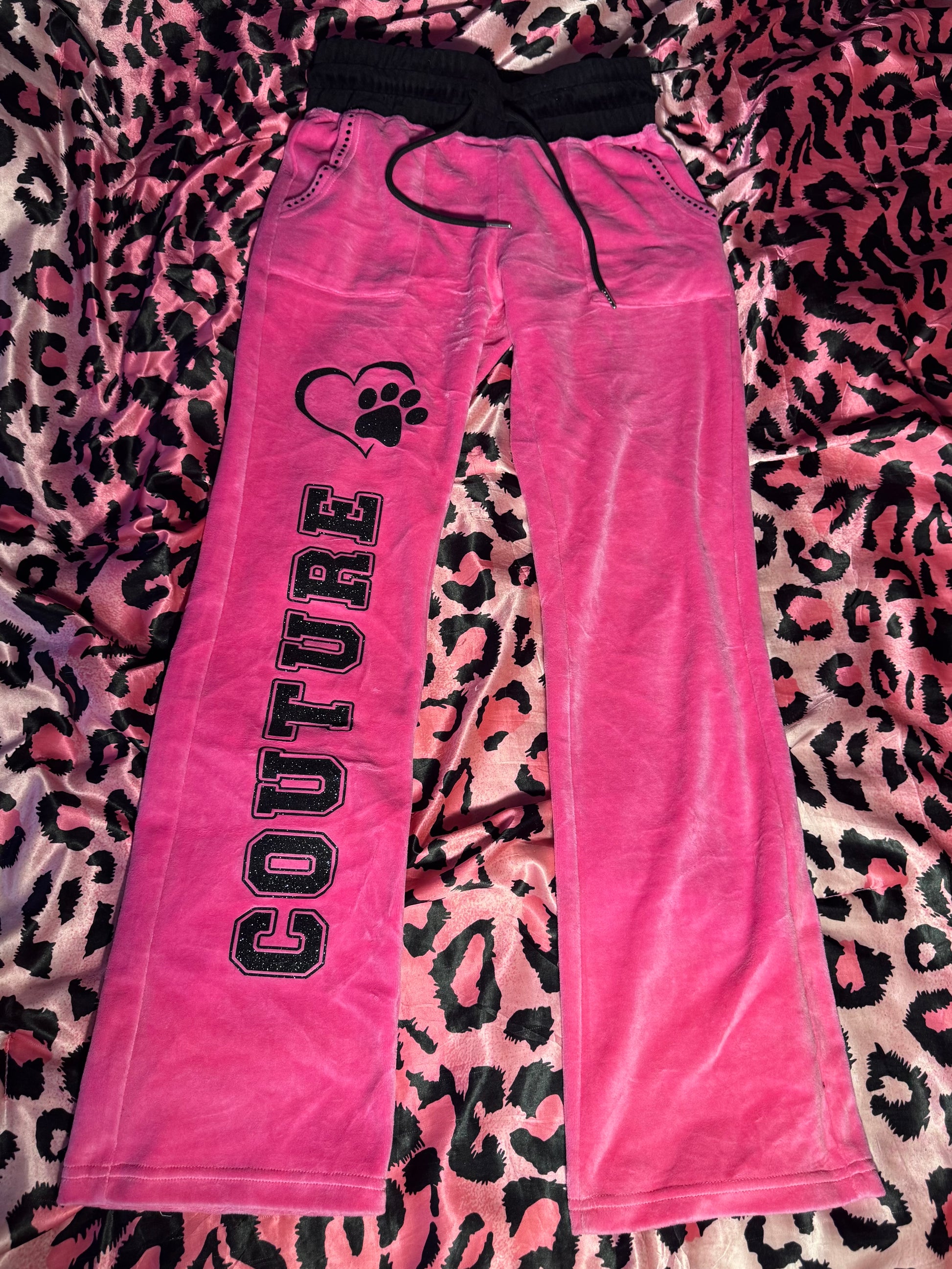 The pants are low rise with a yoga style fit and an adjustable drawstring waistband for a customizable fit. The left leg is embellished with Couture lettering, our logo, and glittery detailing for a bold, statement finish.